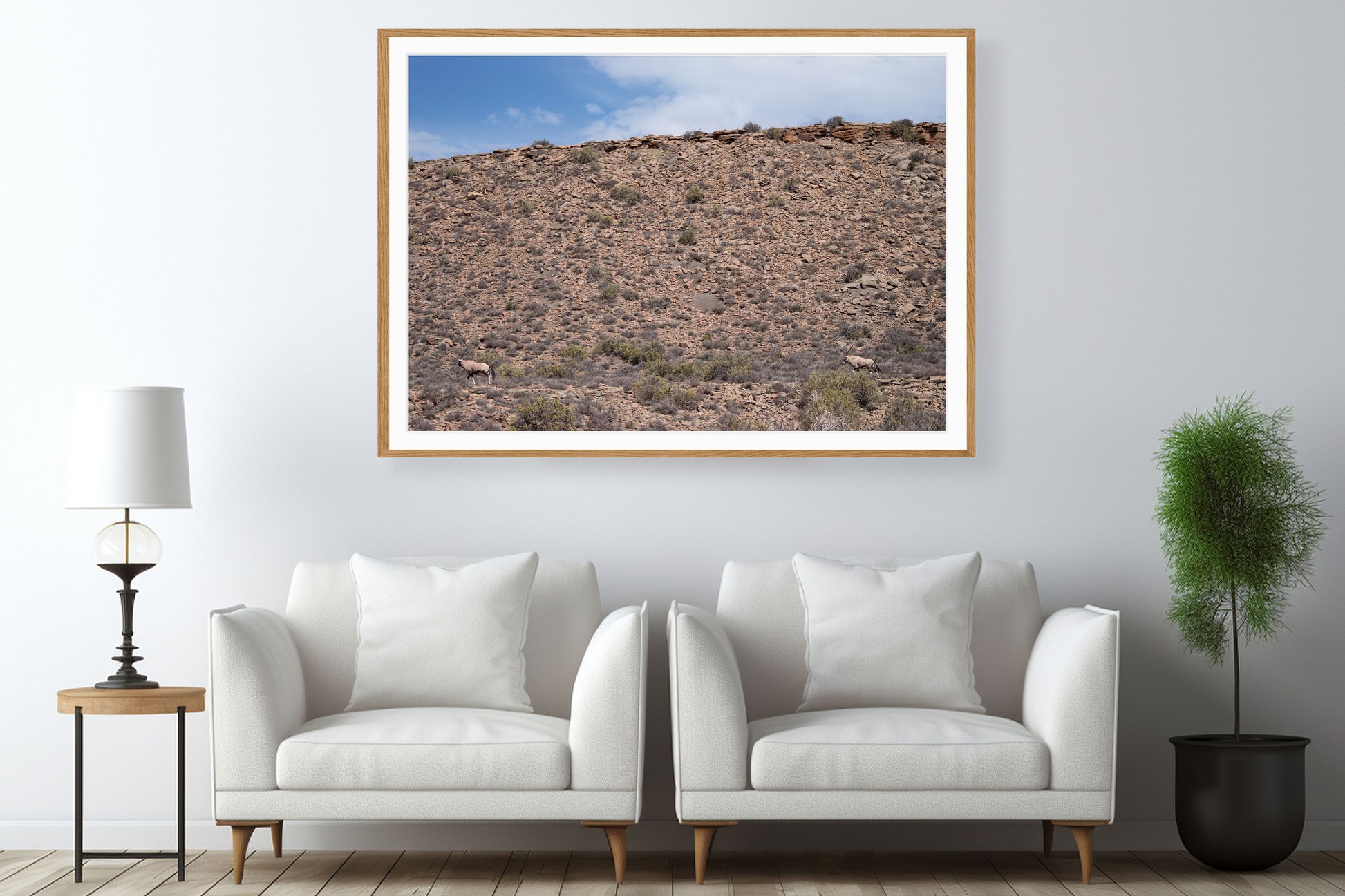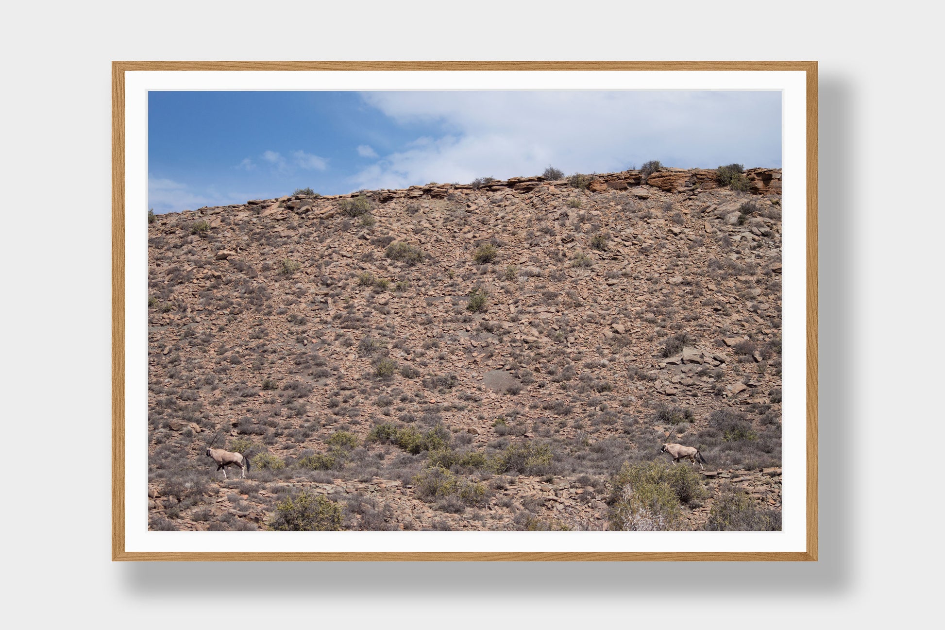 Gemsbok is a striking colour fine art photograph capturing two gemsbok gracefully walking across an open landscape, with a stone-covered hill rising in the background. The earthy tones and elegant composition highlight the quiet strength and beauty of these iconic animals. Printed on premium archival paper, this piece brings a sense of wilderness and timelessness to any space.