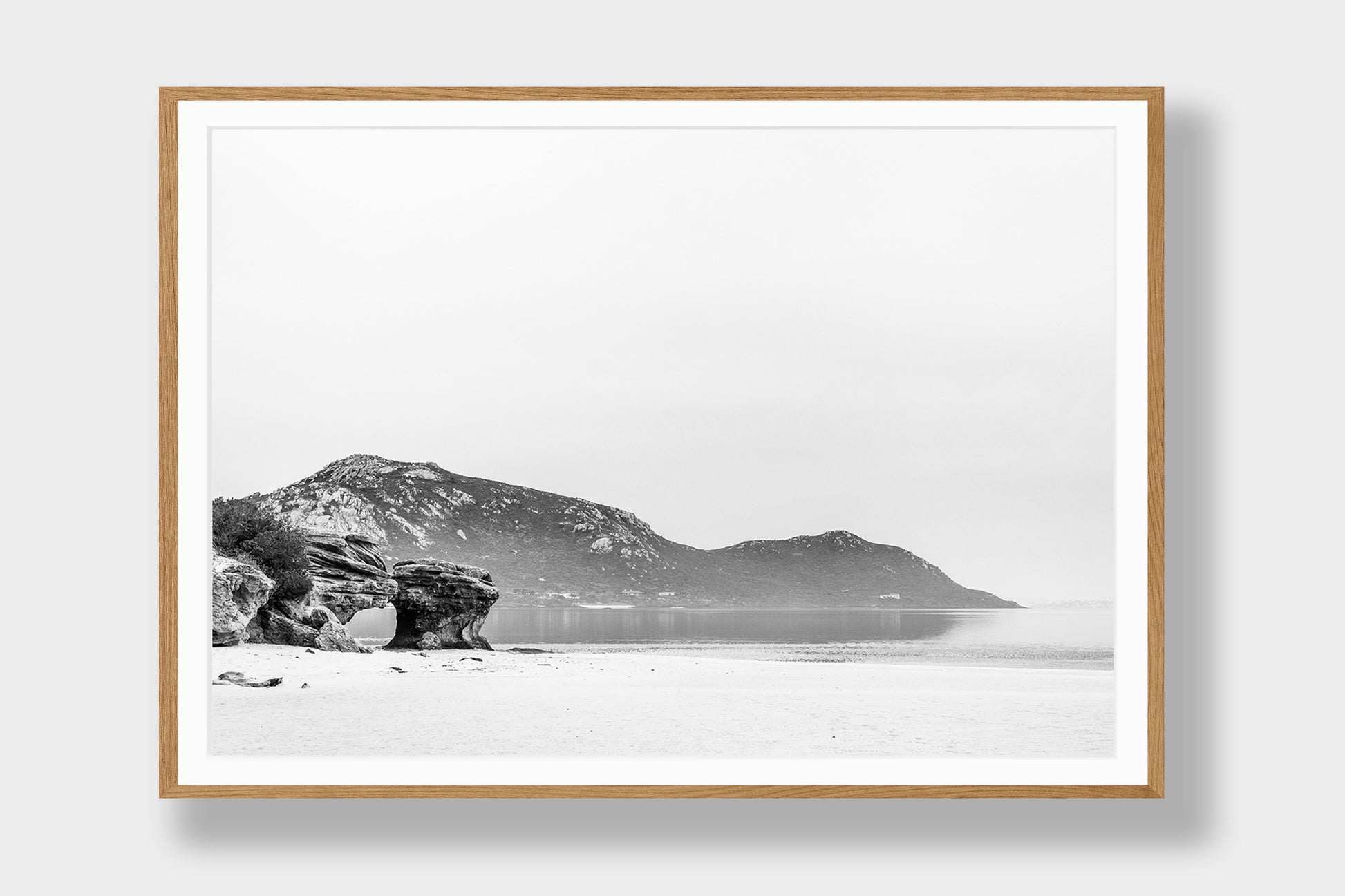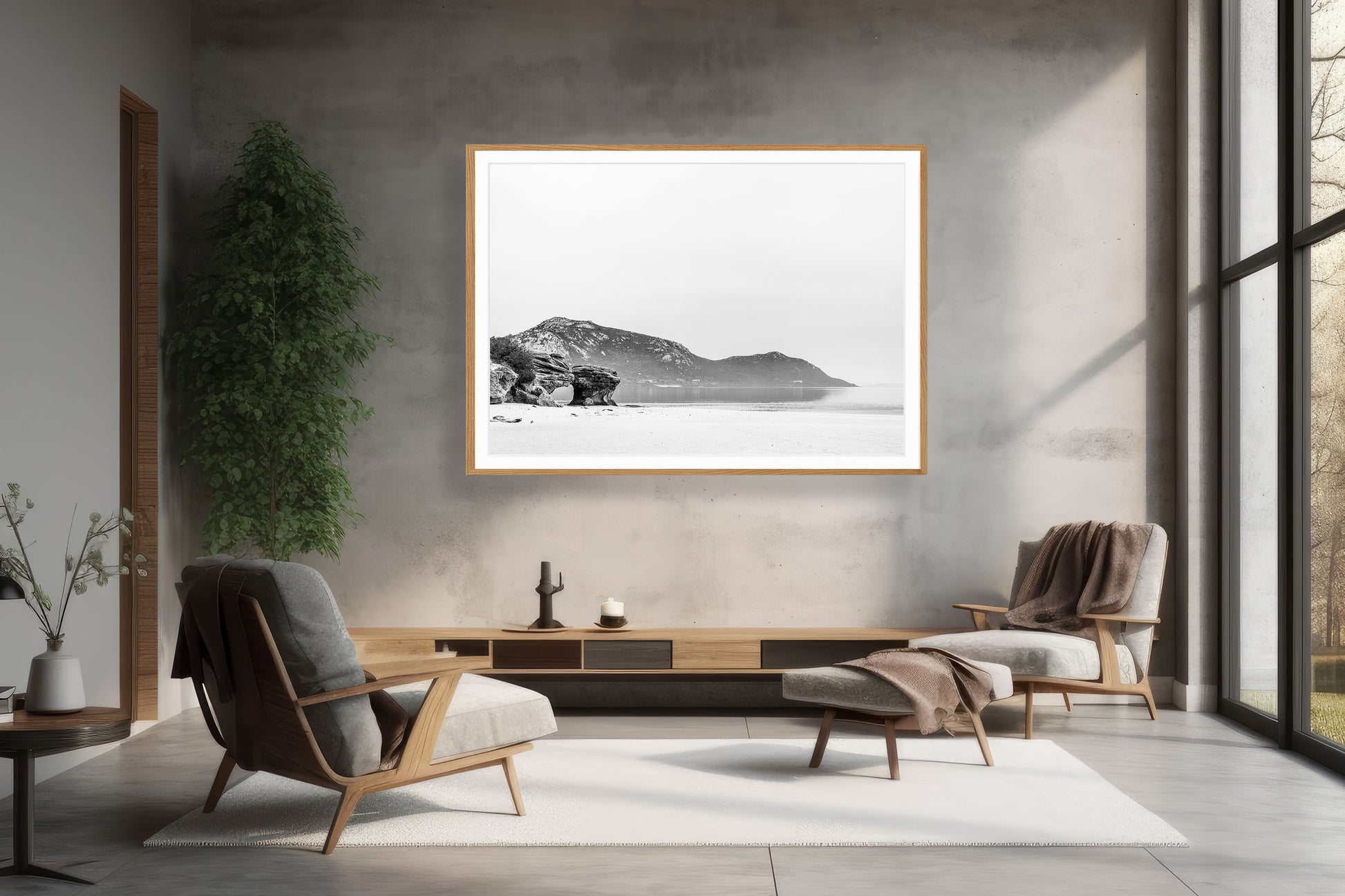Hole in the Rock is a striking black and white fine art photograph featuring a weathered rock with a natural hole, set beside the calm waters of a lagoon. The monochrome tones highlight the texture and form, creating a timeless and contemplative scene. Printed on premium archival paper, this piece adds a sense of quiet strength and natural beauty to any space.